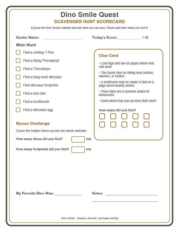 Get ready for a prehistoric adventure! As you explore the Dino Smiles website, keep your eyes open for hidden dinosaurs, sneaky footprints, and fun surprises along the way.